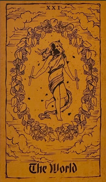I pulled The World card, which essentially speaks to accomplishment and completion. Something may have recently come full circle for you, resulting in an achievement or exciting new step, and you’re feeling proud—or should be, anyway. A project, an assignment, studying for and receiving some kind of certification, brewing a new beer, even birthing an entire human; you’ve reached the culmination of some process or long road of hard work. And if this milestone hasn’t happened for you yet, it’s not far away.